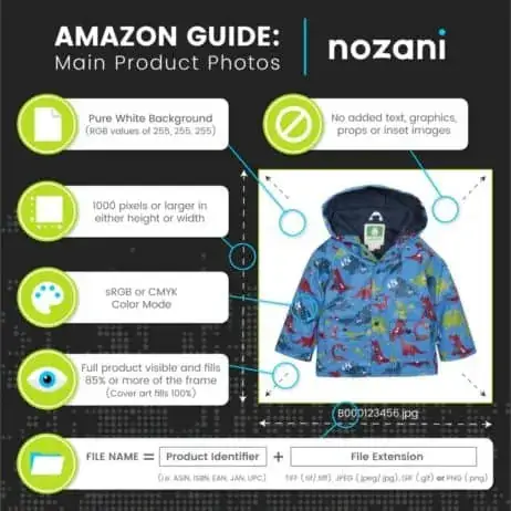 Finally, there are some standards that apply to all Amazon photos*. For example, the color mode, file name, and pixel minimum in the Main Photo graphic above are required for all photos. Other standards of note include: