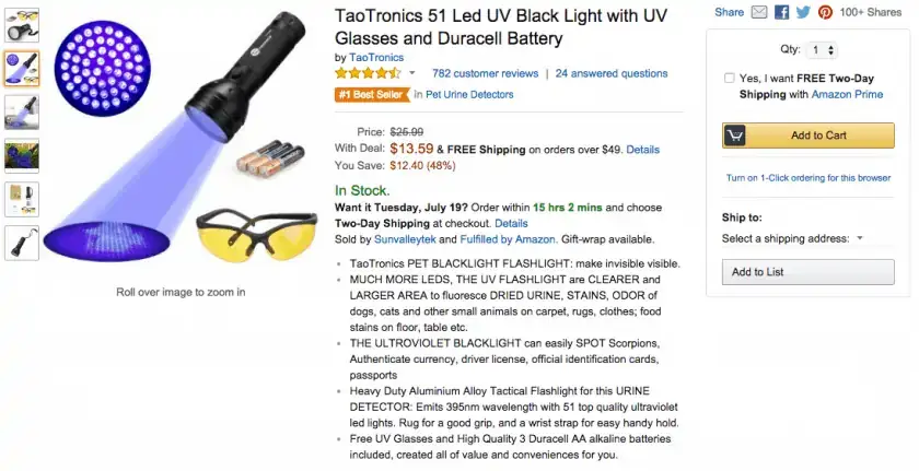 Now the second listing, which is a #1 Best Seller, is branded properly, the creator most likely asked the factory to throw in Duracell batteries, and they found an inexpensive set of safety glasses they rebranded as ‘UV Glasses’ as the added bonus to their bundle. Oh, and there does not seem to be any additional sellers hijacking this listing.